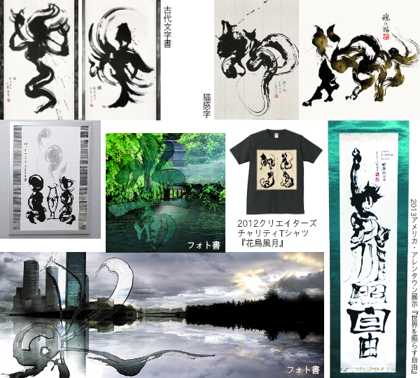 デザイン業の傍ら個展での作品発表やショップ、イベント参加などで展示。グッズ販売等活動しています。7歳より「書道」を学び、 大阪芸術大学デザイン学科グラフィックコース卒業後、印刷・広告デザイナーとして勤務。2006年の初個展より「書」を使った作品を発表し、写真とのCGコラージュ、古代文字やアクション文字、絵画的など、毎回面白い「書」を目指して年数回個展を開催。